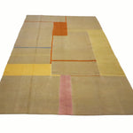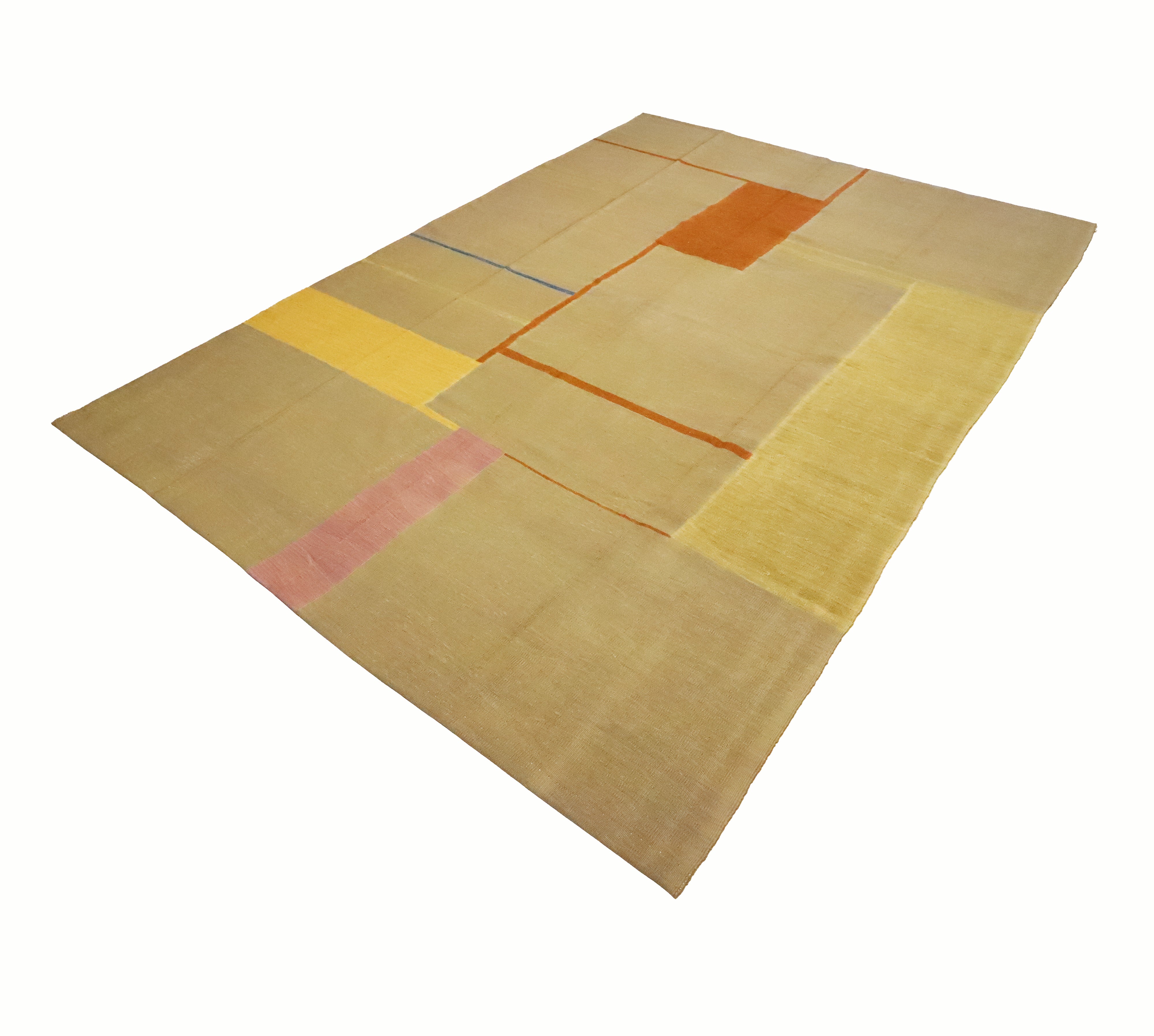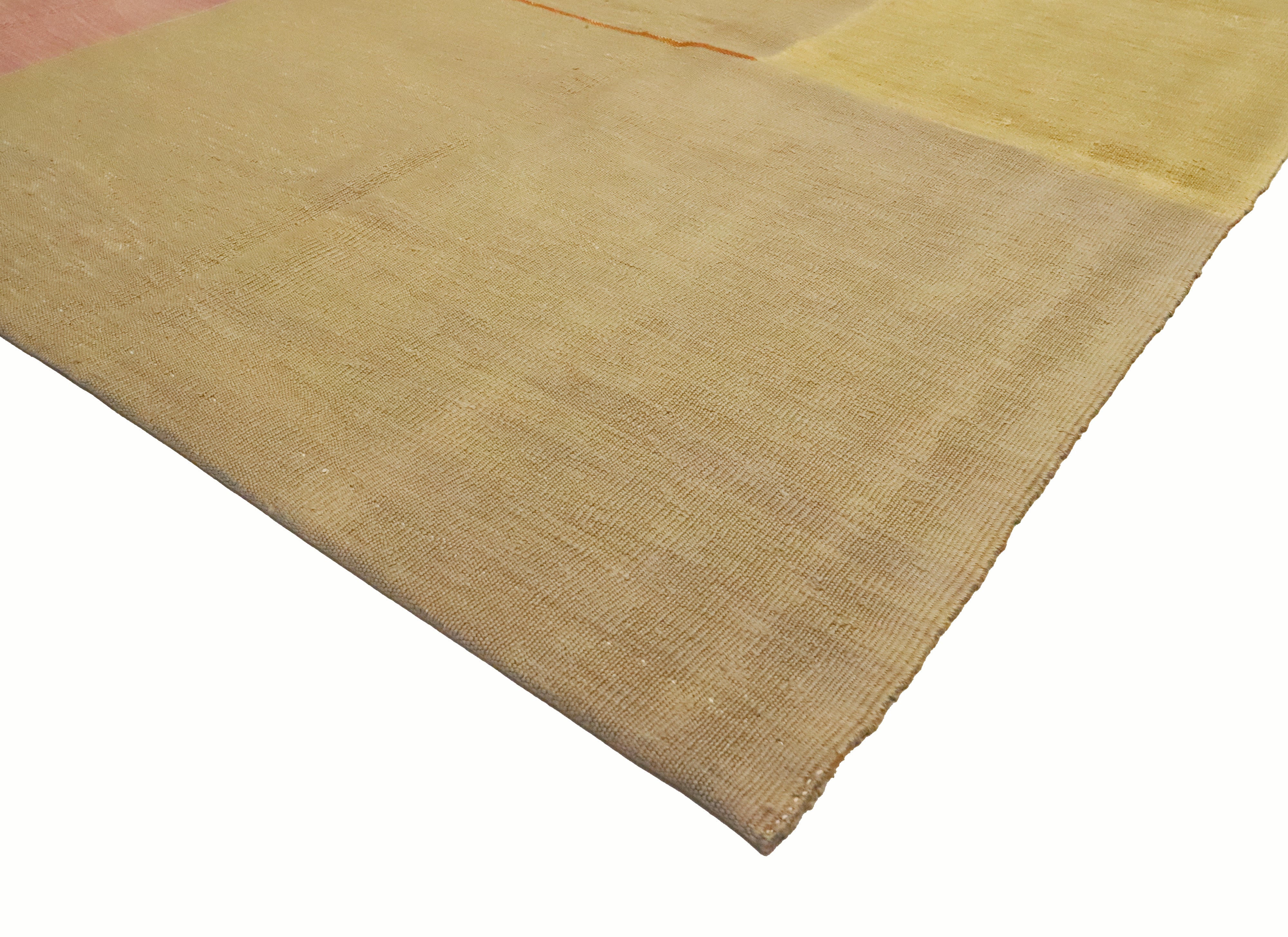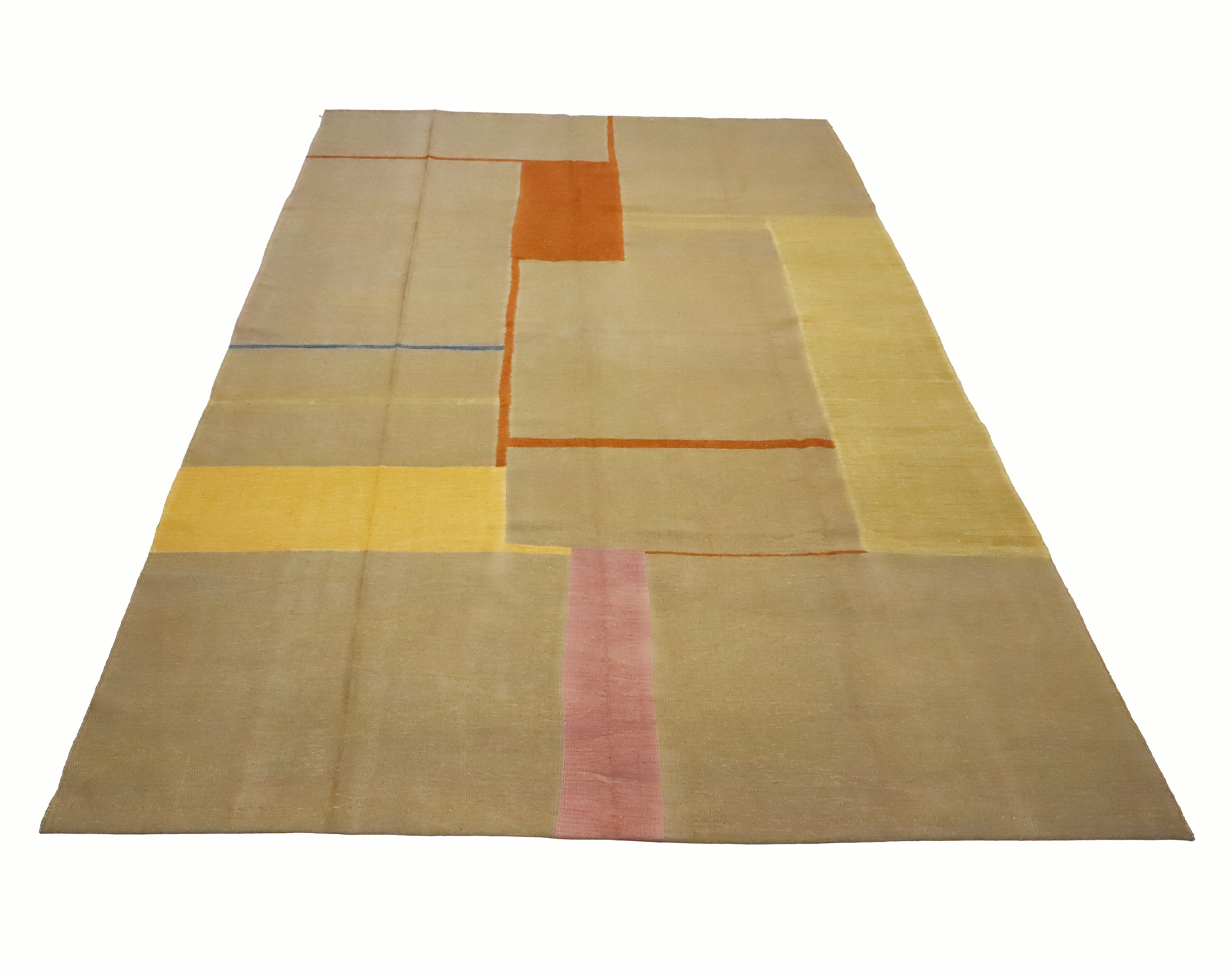 Contemporary Anatolian kilim handwoven by a woman artisan using a traditional flatweave technique. A modern, minimalist composition of large tonal fields is outlined with fine linear borders and punctuated by bands of marigold, blush, and a single powder-blue line. The calm, asymmetrical grid and sun-washed palette bring a refined, architectural feel that layers seamlessly in contemporary, Scandinavian, or coastal interiors.